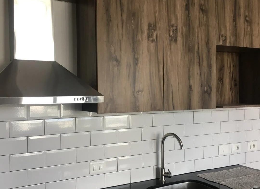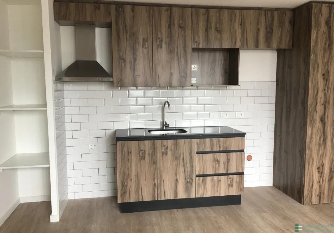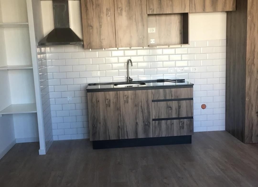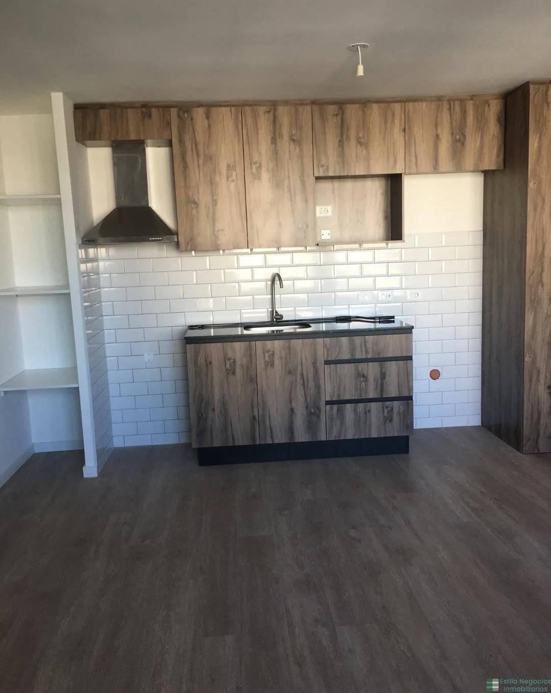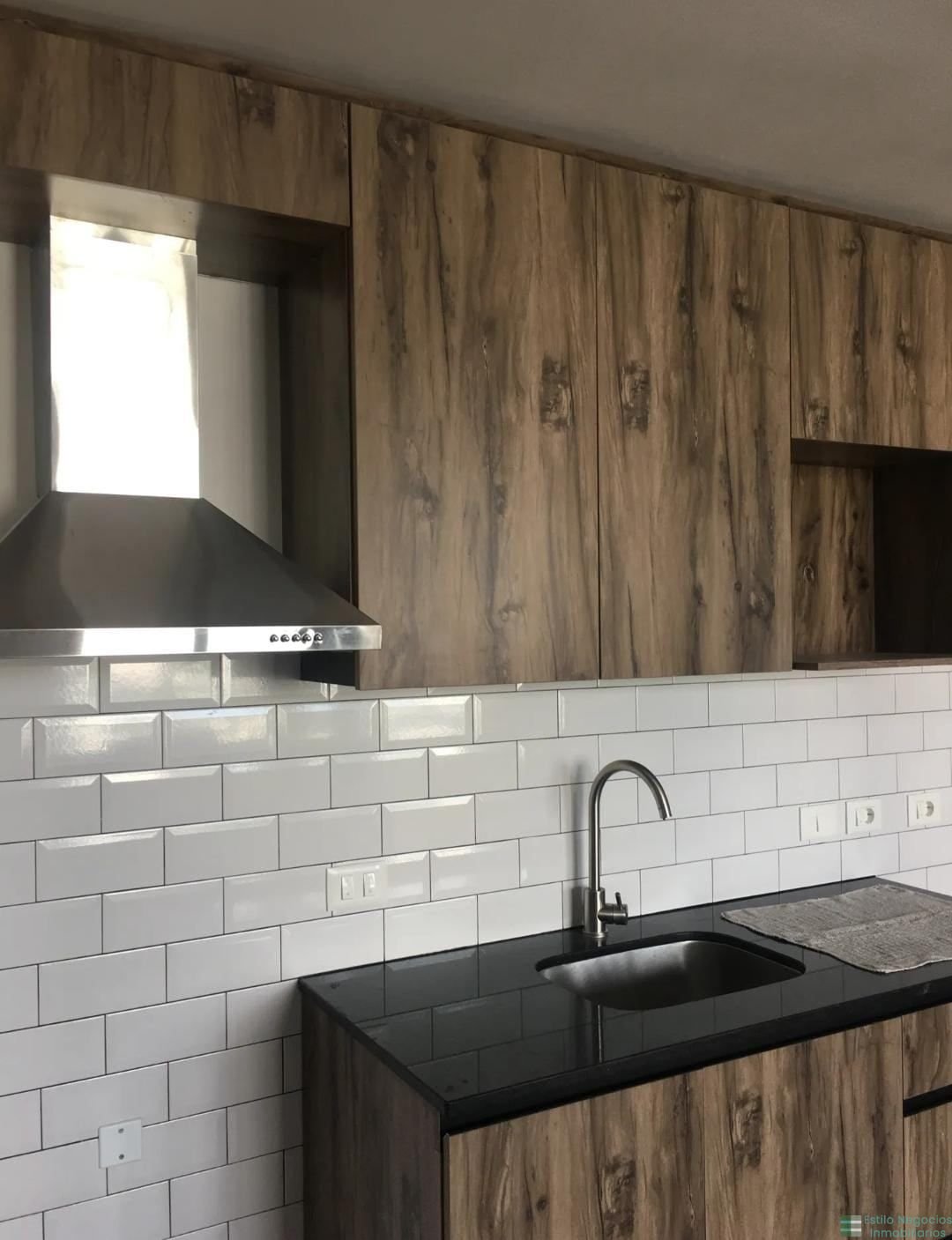 Cocina integrada al ambiente con muebles aéreos y bajo mesada, campana extractora