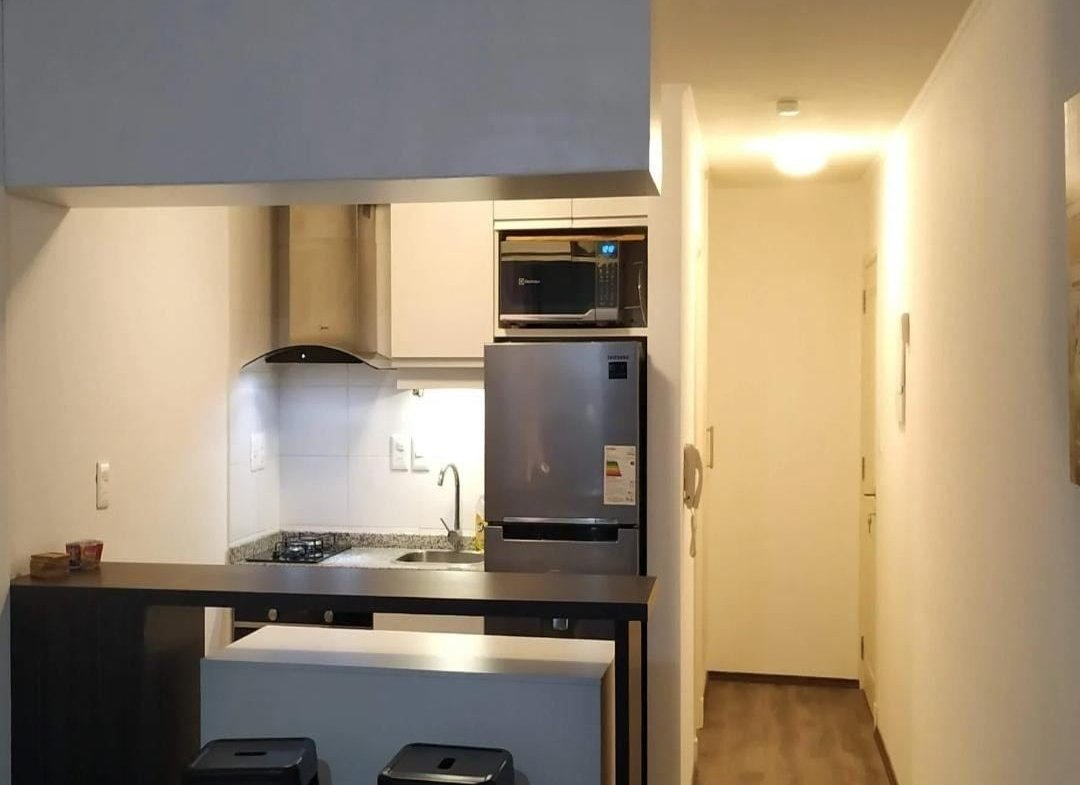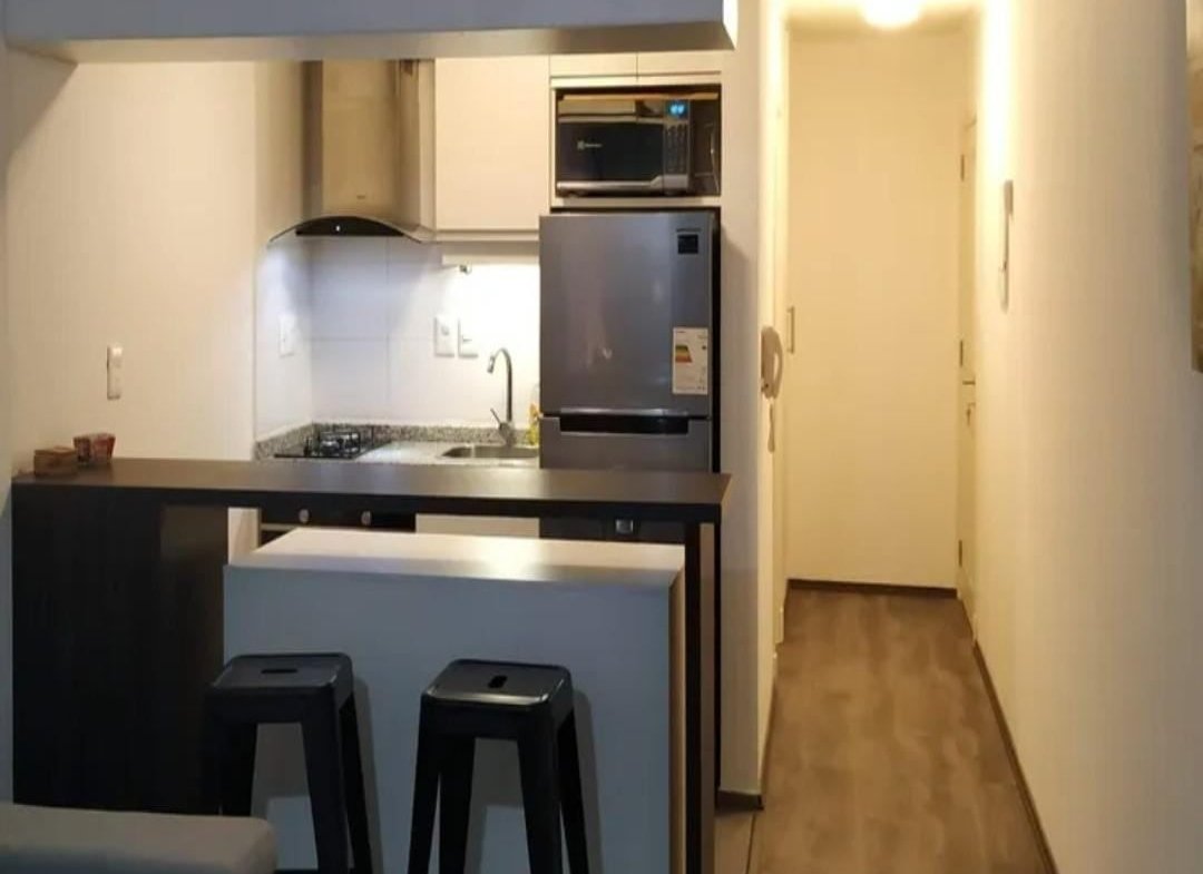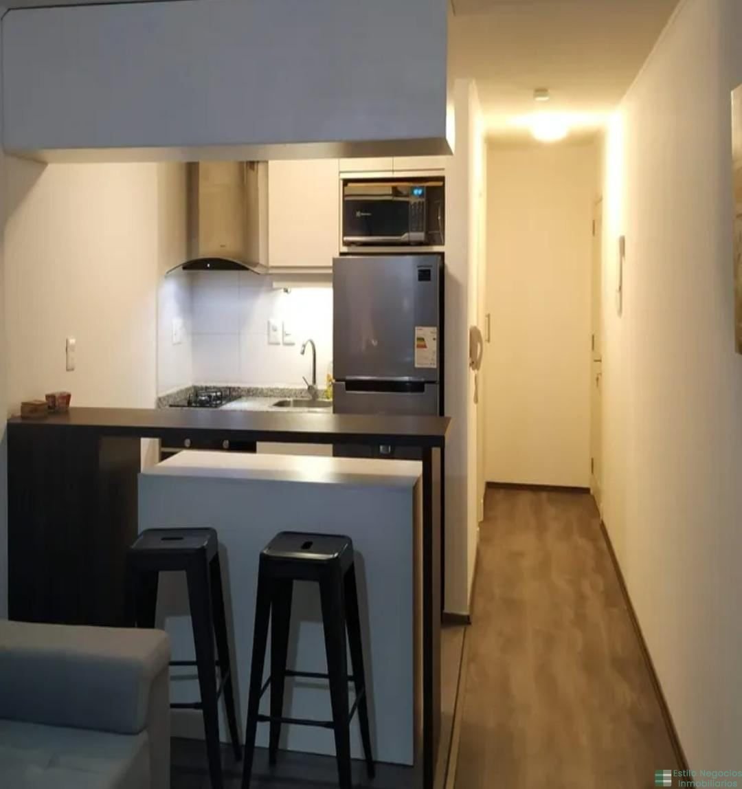 Cocina semiintegrada con muebles aéreos y bajo mesada, desayunador que se integra al ambiente.