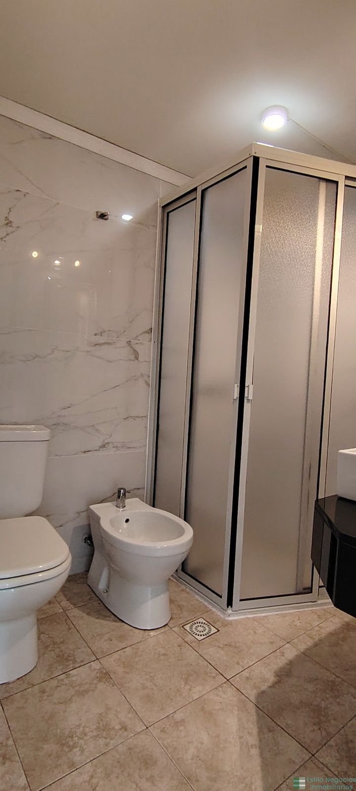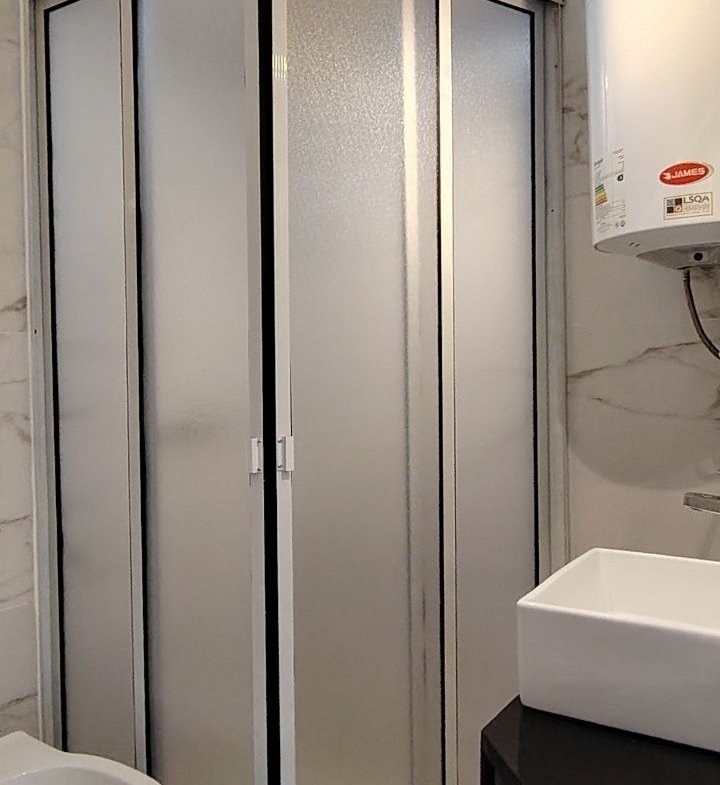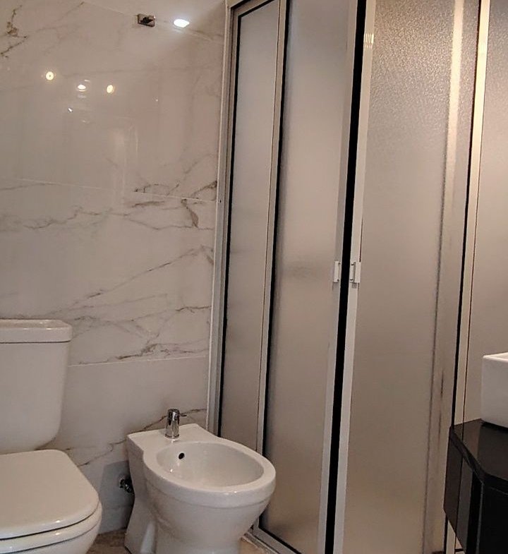 Baño completo con mampara, calefon de 60 litros y extractor de aire.